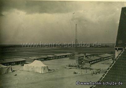 Die Aufnahme wurde vom Dach der Fuchsbergkaserne gemacht und zeigt das Barackenlager für die Nachrichtenschüler. Im Hintergrund ist die neu geschaffene Grünaer Siedlung zu sehen.