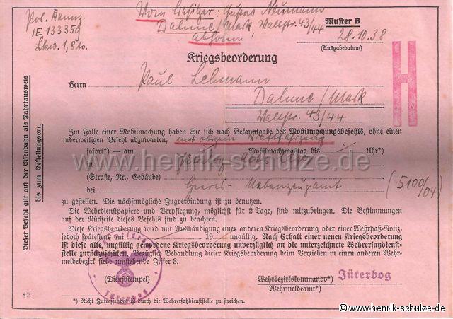 Das Dokument besagt, daß der Halter eines Lkw aus Dahme/Mark sein Auto im Mobilmachungsfall dem Zeugamt Jüterbog zur Verfügung stellen muß.